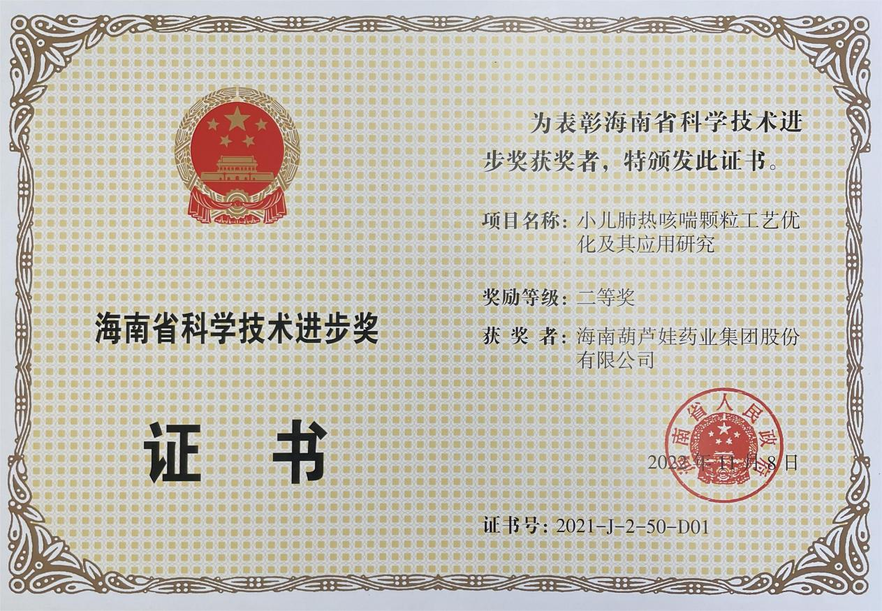 11月15日,海南省科学技术奖励大会在海口召开,揭晓了2021年度海南省科学技术奖。海南拉斯维加斯药业集团股份有限公司凭借“小儿肺热咳喘颗粒工艺优化及其应用研究”,荣获海南省科学技术进步奖二等奖。项目主要完成人有刘景萍、刘全国、胡俊斌、李培湖、刘萍、王家、陈克领、何彦博。